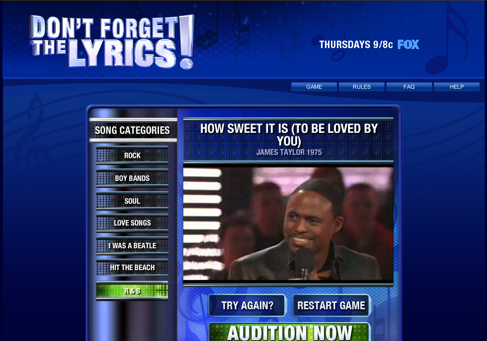 RDF USA hired The Illusion Factory to produce this innovative game to support their game show, hosted by the inimitable Wayne Brady, armed with a $1,000,000 jackpot on Fox. Not only did this Don’t Forget The Lyrics game generate tremendous online play, but the innovative technology that The Illusion Factory added to the game, allowed users to record their audition and submit it to RDF via the internet. This single feature was able to cast more than 50% of the contestants for the second season and set an industry trend of allowing contestants to use websites to record their auditions and submit them online.
